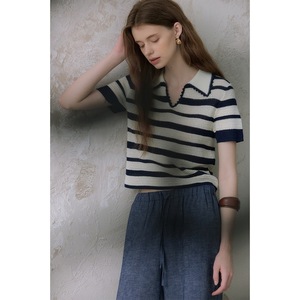 爽やかなテンセルリネンニットコントラストカラーラペル半袖Tシャツ女性用春夏2色手作りかぎ針編みトップス