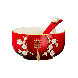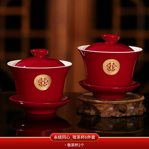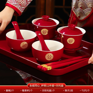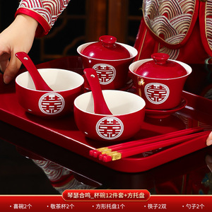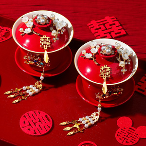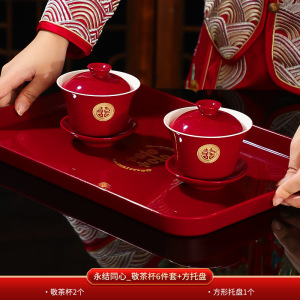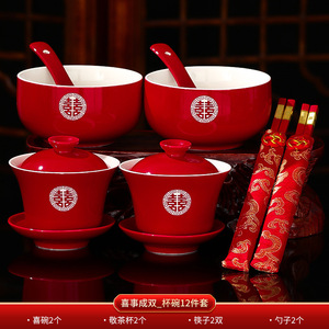 結婚式のお茶カップセット、結婚式のボウルと箸のペア、赤い結婚式の新婚夫婦のティーセット、乾杯、結婚式の贈り物用品