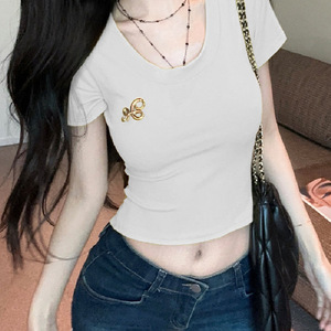 短款设计上衣女小众露脐短袖镂空蕾丝露辣妹拼接修身显瘦后背T恤