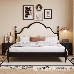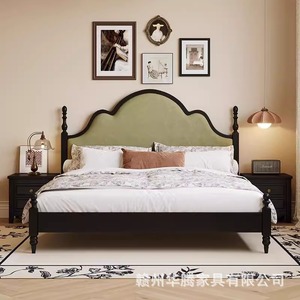 フレンチレトロベッド無垢材1.5mソフトバック1.8mダブルベッドブラックミッドセンチュリースタイルマスターベッドルームハイエンド雰囲気家具