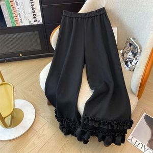 大きいサイズの人気レースパンツ春夏新作ワイドレッグパンツ小柄な人向け黒ゆったり耳付きワイドレッグ9点パンツ