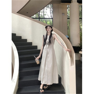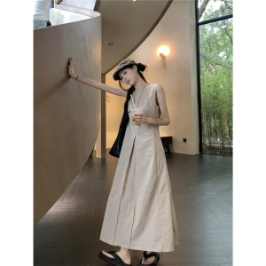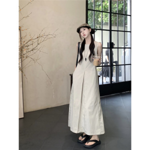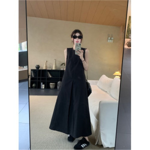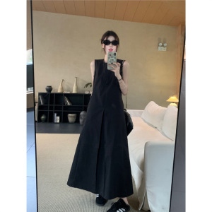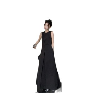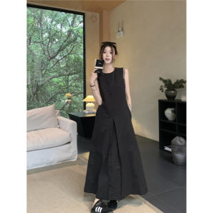 女性のためのハイエンドの黒のベストドレス夏の新しいデザインプリーツウエスト痩身ノースリーブロングスカート