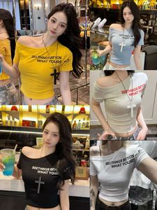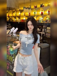 [綿92、スパンデックス8]夏新作スリムレタープリント半袖Tシャツデザインスリムフィットトップス女性用