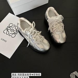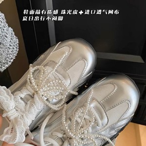 シルバーの女性用道徳訓練靴、インナー高さレースパール、春夏小柄メッシュカジュアルスポーツフォレスト・ガンプ小シルバー靴