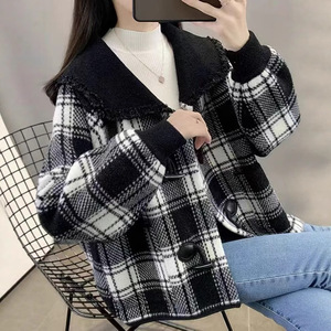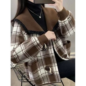 复合龙凤呢大码胖秋冬外套小香风格子开衫外搭牛角扣珍珠绒上衣