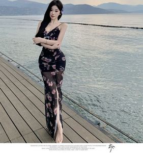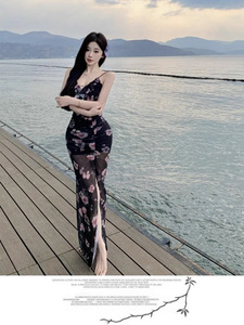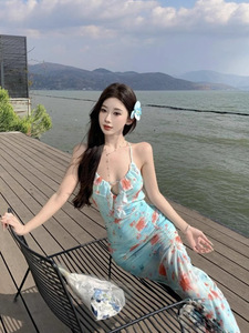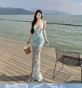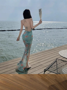 甘辛ミックスのハイカットスリット入りスリムフィットバックレスワンピース、夏の三亜撮影用ビーチドレス、海辺のリゾート雰囲気のスカート