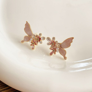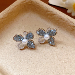 30#シルバー ニードル ジルコン パール ドロップ バタフライ フラワー スタッド ピアス
