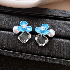 29#シルバー ニードル ダイヤモンド スクエア ジルコン フラワー パール スタッド ピアス