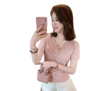 韓国風デザインビーズファッションVネック半袖Tシャツ2025夏新作スリムフィットウエスタンスタイルボトムストップ