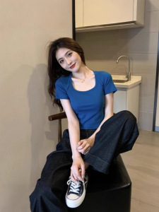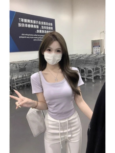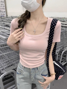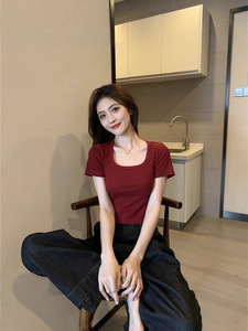 Tシャツレディース半袖2025春夏タイトフィットレイヤードレディースフィットスリムソリッドカラースレッドショートTシャツトップ