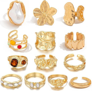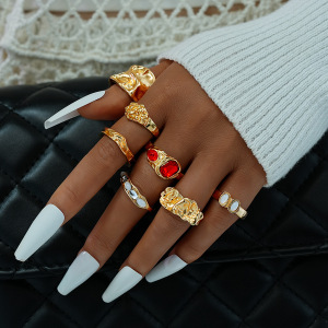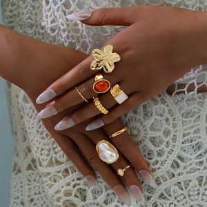 ヨーロッパとアメリカの国境を越えたスタックインスタイルジェムストーン特殊形状パールリングセット女性用ノックパターンオープンワイドリングブレスレット