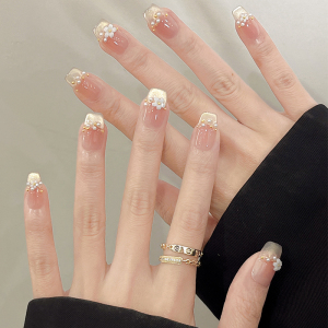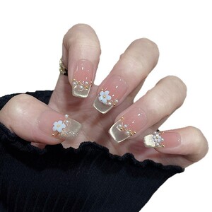 純粋に手作りのウェアラブルネイル 2025 新しいハイエンドショートマニキュアシルバーキャットアイホワイトヌードカラー春の花