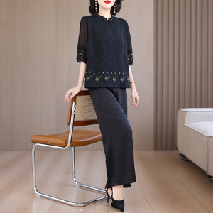 高品質大きいサイズお腹カバーと年齢軽減ママ夏新作新中国風ゆったりワイドパンツシャツツーピーススーツ