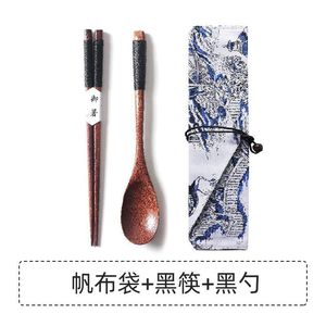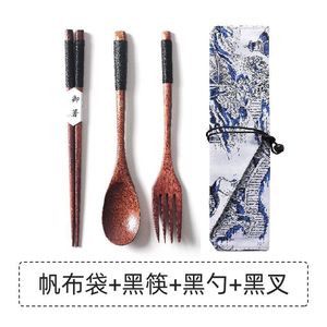 茶色のラインの箸 + スプーン + フォーク + キャンバスバッグ