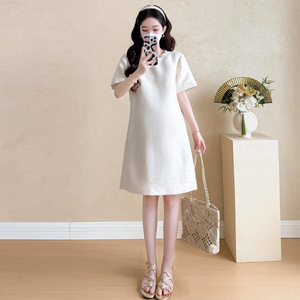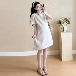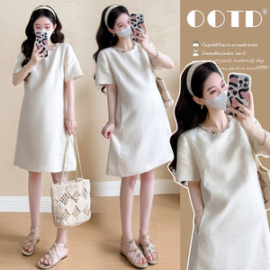 超気質ホットマママタニティウェアビーズリネンスモールフレグランスドレス女性の夏の妊娠半袖ヘビーデューティマタニティドレス