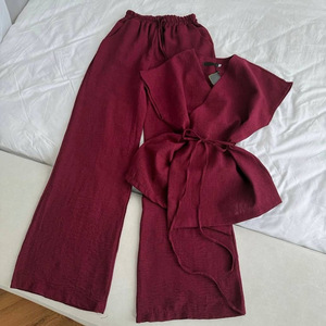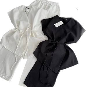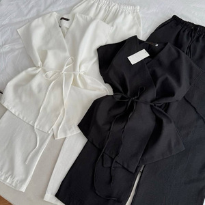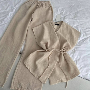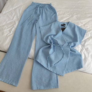 ヨーロッパとアメリカのクロスボーダー婦人服 2025 夏の新しい気質 V ネックレースアップウエストトップワイドレッグパンツカジュアルスーツ