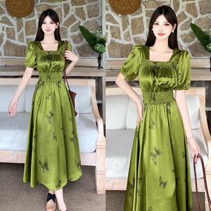 ドロップシッピングエメラルドグリーンエレガントサテンジャカード弾性蝶花ハイウエストスクエアネック超妖精気質越境電子商取引