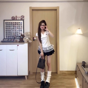 韓国シックなアメリカンホットガールスリムレーススプライシングVネック半袖Tシャツレディースサマーレタープリントスリムトップ