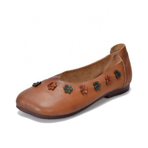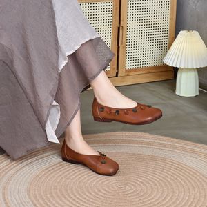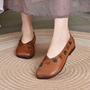 Longlin 2025 秋の新フラワー牛革浅口シングルシューズフラットソール快適で多用途のソフトソール本革ビーニーシューズ女性用