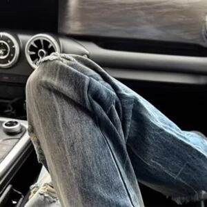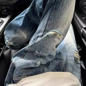 ライトブルーのライトニングパターンリップドジーンズメンズハイウエストスリムフィットパンツアメリカンハイストリートスモールブーツカットパンツ