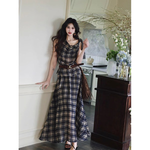 レイジーチェック柄スーツレディースノースリーブスイングカラーベストトップ+ロングスカート2点セットスリムブラックスーツ