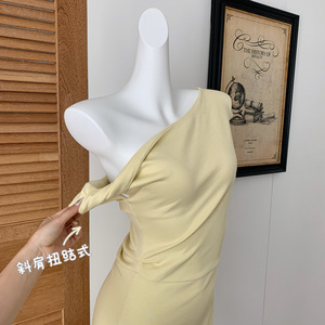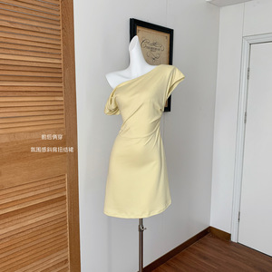 フレンチスタイルのオフショルダーデザインの女性用黄色のドレス、夏のユニークで美しいピンチウエストスカート