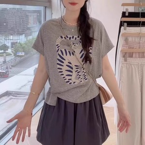 ピュアコットン猫プリント半袖Tシャツレディースプラスサイズ少し太ったMM夏サイドボタンウエストTシャツ多用途痩身トップ