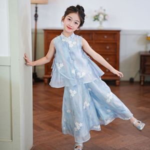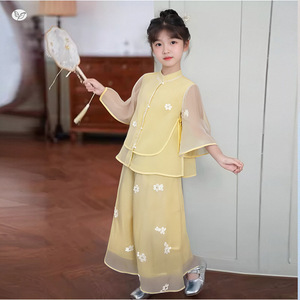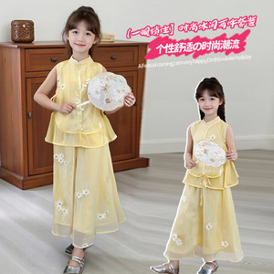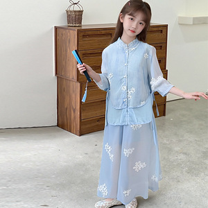 女の子韓服スーツ夏 2025 新しい国民風刺繍シフォン 2 点セット中大型子供薄い子供のキュロット