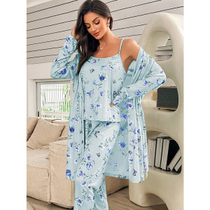クロスボーダープラットフォーム工場在庫ホームパジャマヨーロッパとアメリカのサイズのナイトガウンズボンサスペンダーナイトガウンスリーピーススーツ