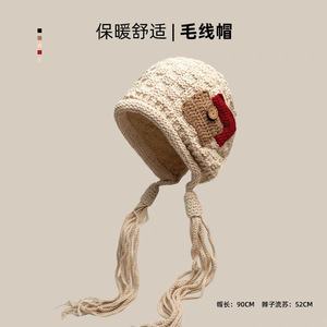 日本のインターネットセレブの女性用タッセル付き赤いウール帽子、秋冬韓国版、甘くてかわいい耳保護暖かい包頭ニット帽子