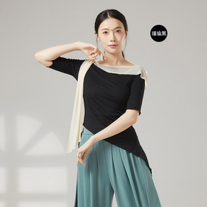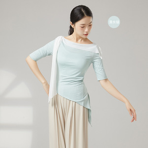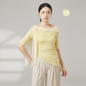 女性用モダンダンス練習服、メッシュステッチ不規則トップス、ダンス学生の日常着、ボディトレーニング服