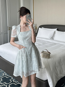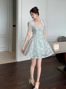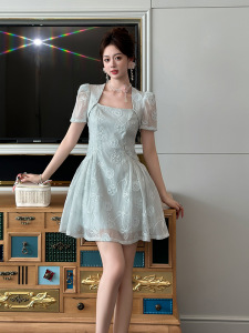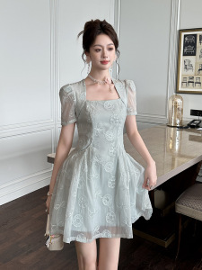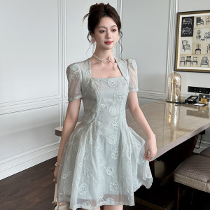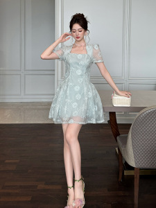 2025 新しい夏の女性のフレンチスクエアネックウエスト A ラインふわふわレースドレス絶妙なショートスカート 21770