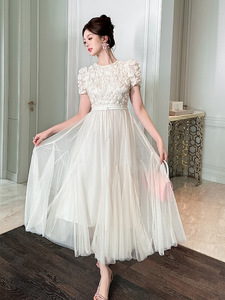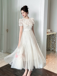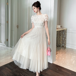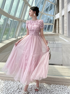 2025 新しい夏の女性の甘い気質立体ローズウエストメッシュ大裾ドレス 11554