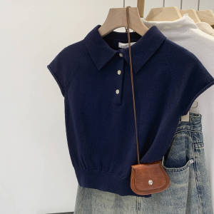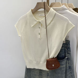 高級ポロカラーラグランスリーブニット半袖レディース夏ボタンショートトップ気質万能ボトムTシャツ