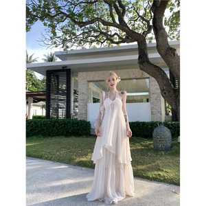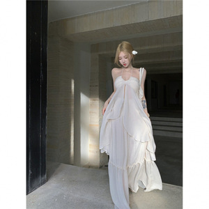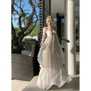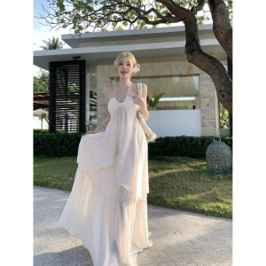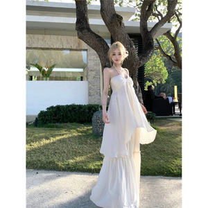 度假风套装法式超仙露背挂脖背心女夏季穿搭高腰半身裙长裙两件套