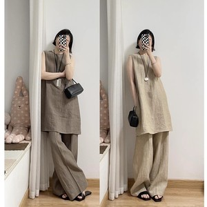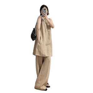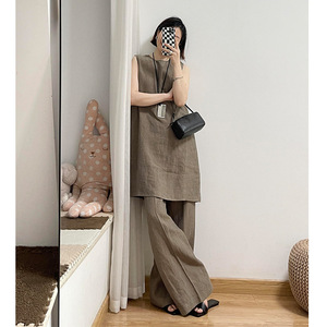 3555 リネンスーツレディース夏のファッションリラックス着用レイヤードベストスカートワイドレッグパンツコットンとリネンの2点セット