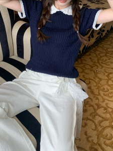 天才少女レースドールカラー半袖右肩Tシャツレディーススリムニットボトムストップ夏