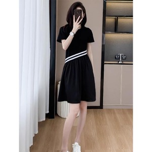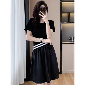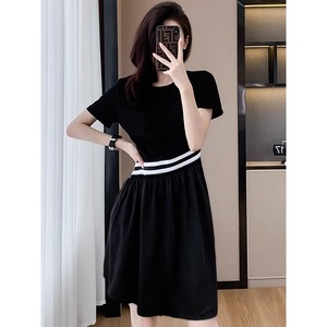 夏の新作ラウンドネックゆったりお腹カバー痩身人気ウエスト半袖パッチワーク半袖ワンピース A4157