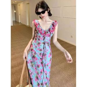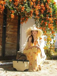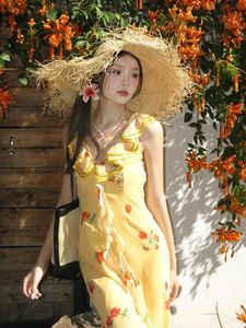 フレンチ V ネック黄色の花柄サスペンダードレス女性の夏の気質ウエスト痩身ドーパミン甘いロングスカート