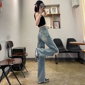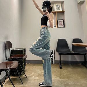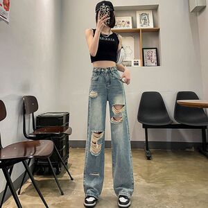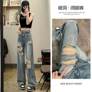 破洞牛仔裤女夏季薄款2025年高腰显瘦直筒宽松乞丐破洞垂感阔腿裤