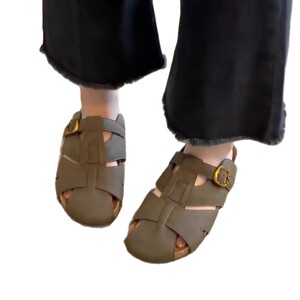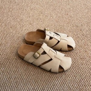 シープスキンバージョン〜女性用本革レトロ多用途アウタービルケンシュトックシューズ、織り中空厚底スーパーソフトつま先シューズ