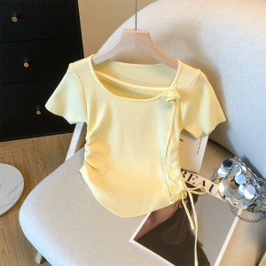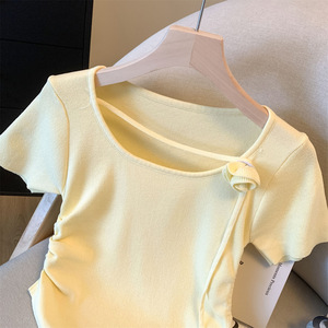 韩系立体花朵拼接冰丝短袖短款针织T恤收腰抽褶上衣女夏