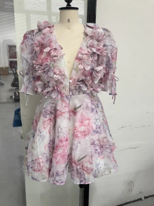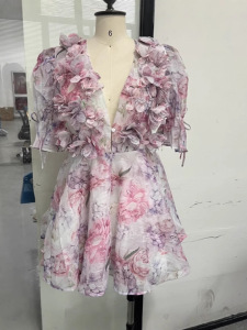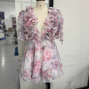 外国貿易ヨーロッパとアメリカ 2025 夏の女性の甘くて新鮮な 3D 装飾セクシーなバックレススリムプリントディープ V ドレス
