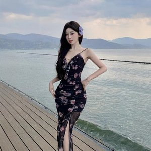 心ときめく雰囲気のリゾート風甘辛ハイ スリットウエスト花柄ワンピース ビーチ撮影用ピュアデューティー