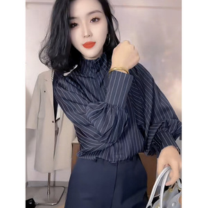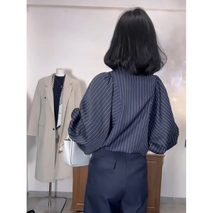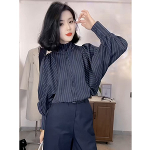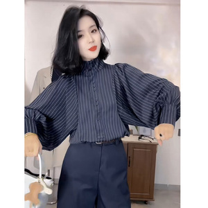 2025 春の新レトロストライプルーズスリムニッチシックスタンドカラーバブルスリーブ人気シャツ女性のための