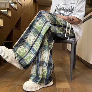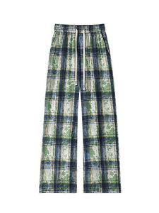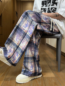 アメリカンタイダイチェック柄アイスシルクパンツメンズ夏薄手ルーズストレートカジュアルパンツトレンディな万能ワイドレッグパンツ
