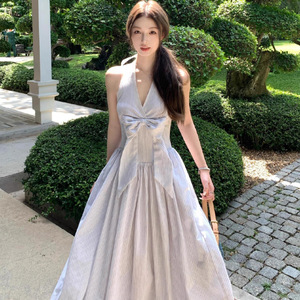 フレンチスタイルの純粋な欲望のフィッシュボーンウエストホルターVネックリボンドレスレディース夏の新しい海辺の休暇スカート
