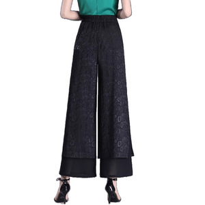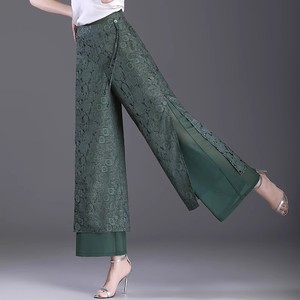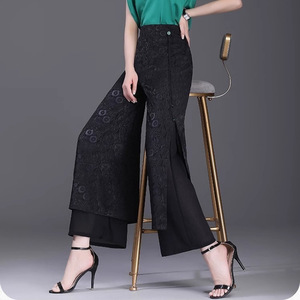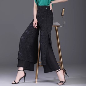 中国風のスリットパンツ女性の夏薄いハイウエストルーズストレートパンツスリムドレープジャカードアイスシルクワイドレッグパンツ