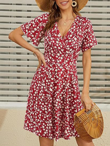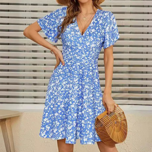 2025 新しいヨーロッパとアメリカのクロスボーダーレディースサマードレス夏と秋の花柄半袖ラップ V ネック A ラインドレス