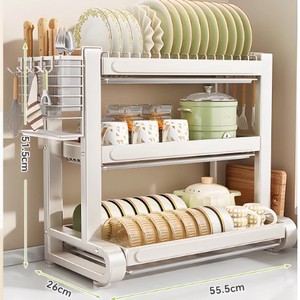 マットホワイト カウンタートップディッシュラック 3段 55cm + 包丁・箸ホルダー + フック4個